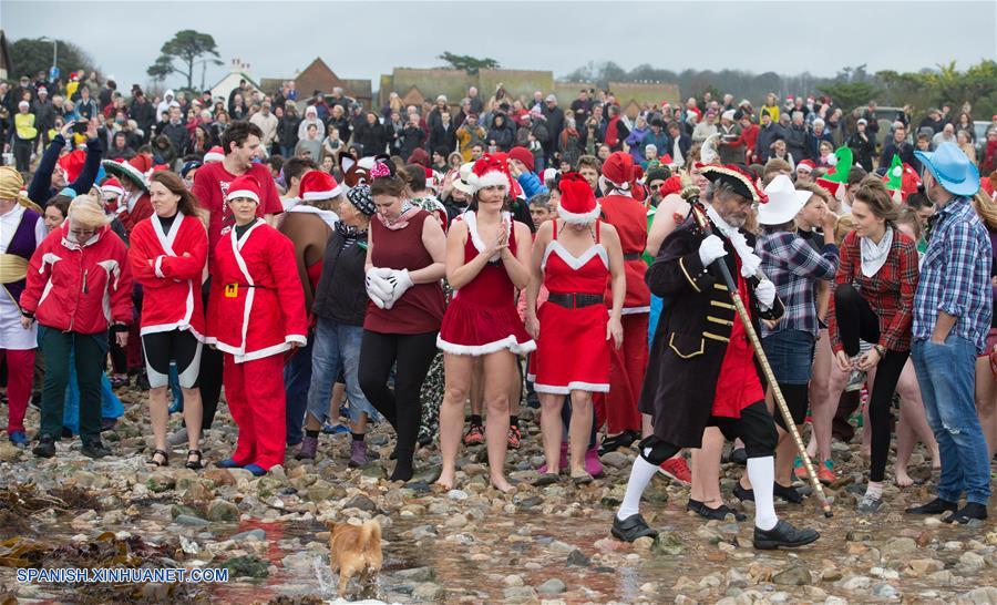 DORSET, diciembre 25, 2016 (Xinhua) -- Residentes participan en el chapuzón navide?o para recaudar fondos para la organización de caridad "Royal National Lifeboat Institution" (RNLI), en Dorset, Reino Unido, el 25 de diciembre de 2016. (Xinhua/Mark Thomas/i-Images/ZUMAPRESS)