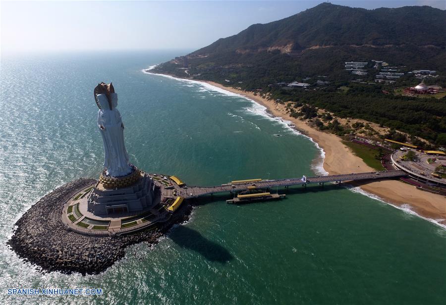 HAINAN, diciembre 25, 2016 (Xinhua) -- Vista aérea de la estatua budista de 108 metros de altura de Avalokitesvara Bodhisattva, o Guanyin, en el resort de Nanshan en Sanya, en la provincia de Hainan, en el sur de China, el 25 de diciembre de 2016. Cerca de 15,000 turistas visitaron la estatua cada día desde el 1 de diciembre. (Xinhua/Yang Guanyu)