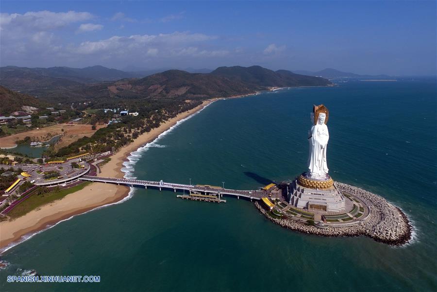HAINAN, diciembre 25, 2016 (Xinhua) -- Vista aérea de la estatua budista de 108 metros de altura de Avalokitesvara Bodhisattva, o Guanyin, en el resort de Nanshan en Sanya, en la provincia de Hainan, en el sur de China, el 25 de diciembre de 2016. Cerca de 15,000 turistas visitaron la estatua cada día desde el 1 de diciembre. (Xinhua/Yang Guanyu)
