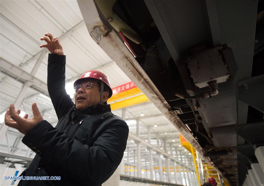 BEIJING, diciembre 25, 2016 (Xinhua) -- Un técnico presenta el primer tren de levitación magnética de velocidad media-baja, Línea S1, de Beijing, en la ciudad de Beijing, capital de China, el 25 de diciembre de 2016. Se espera que la La Línea S1, que conecta al distrito oeste de Mentougou de la ciudad, con la estación de metro de Pingguoyuan en el distrito de Shijingshan, comience a funcionar en 2017. Con una velocidad máxima de 100 kilómetros por hora, el tren parará en ocho estaciones, y transportará a cerca de 1,302 pasajeros cada vez. (Xinhua/Luo Xiaoguang)