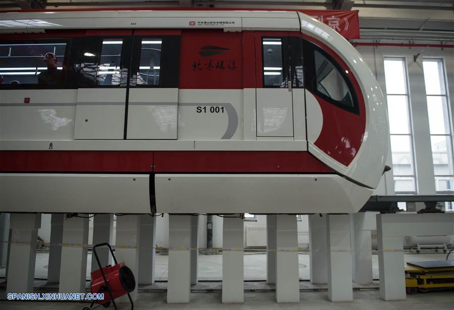 BEIJING, diciembre 25, 2016 (Xinhua) -- Vista del primer tren de levitación magnética de velocidad media-baja, Línea S1, de Beijing, en la ciudad de Beijing, capital de China, el 25 de diciembre de 2016. Se espera que la La Línea S1, que conecta al distrito oeste de Mentougou de la ciudad, con la estación de metro de Pingguoyuan en el distrito de Shijingshan, comience a funcionar en 2017. Con una velocidad máxima de 100 kilómetros por hora, el tren parará en ocho estaciones, y transportará a cerca de 1,302 pasajeros cada vez. (Xinhua/Luo Xiaoguang)