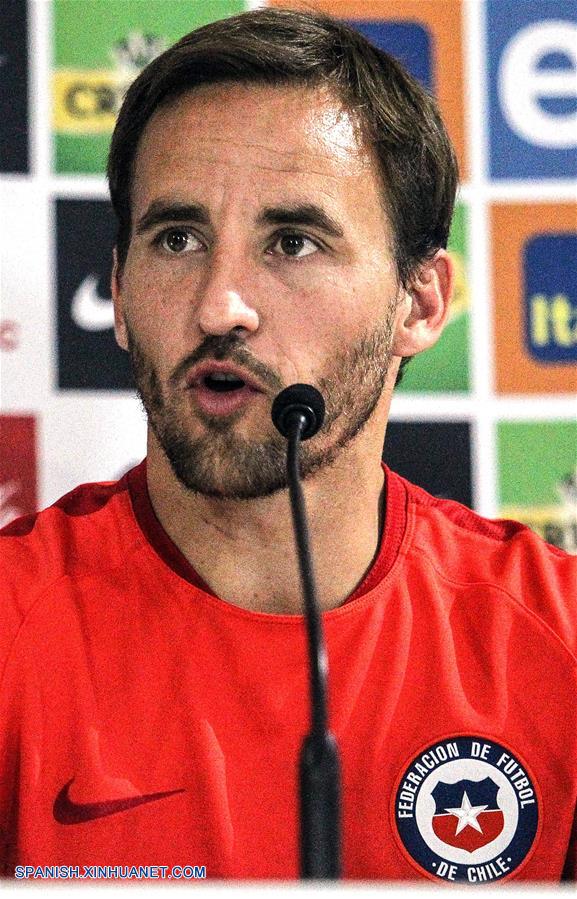 SANTIAGO, diciembre 28, 2016 (Xinhua) -- Imagen cedida por la Asociación Nacional de Fútbol Profesional (ANFP) de Chile, del jugador José Pedro Fuenzalida, de la selección nacional de fútbol de Chile, participando durante una conferencia de prensa en el Complejo Deportivo Juan Pinto Durán, en Santiago, capital de Chile, el 28 de diciembre de 2016. De acuerdo con información de la prensa local, Chile se prepara para participar en el torneo "China Cup 2017" que se llevará a cabo del 10 al 15 de enero de 2017 en Nanning, China. (Xinhua/ANFP)