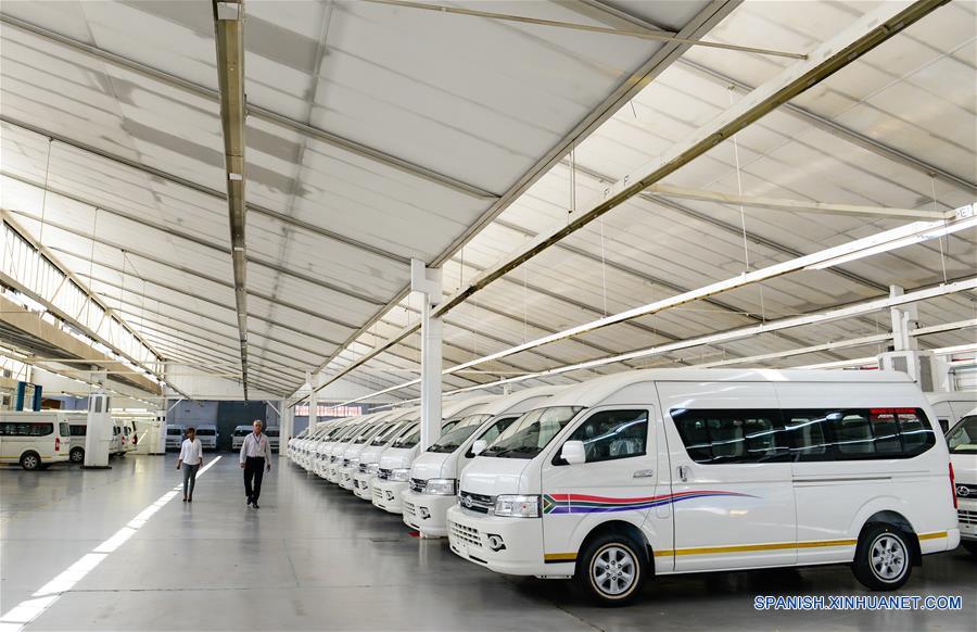 La foto presenta a dos empleados pasando por una fila de autobuses en Sudáfrica el 19 de abril. El autobús SASUKA fabricado por empresa mixta chino-sudáfrica es popular en el país africano. (Xinhua/Zhai Jianlan)