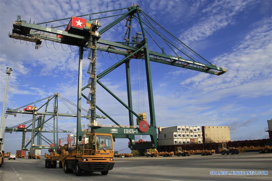 La foto muestra el puerto Lomé, en Togo, en el que se ven varios cranes fabricados por China transportando mercancías. (Xinhua/Zhang Gaiping)