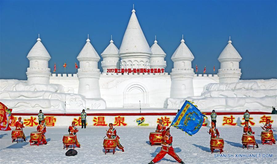Una ceremonia de inauguración es llevada a cabo para el 2 Festival Internacional de Hielo, Nieve y Aguas Termales de Jinzhou, en Jinzhou, provincia de Liaoning, en el noreste de China, el 3 de enero de 2017. (Xinhua/Yang Qing)