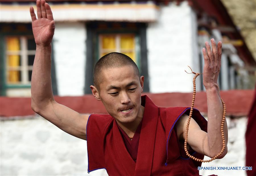 Imagen del 2 de enero de 2017 de un monje debatiendo sobre los sutras del budismo tibetano durante un ensablaje de dharma en la lamasería Jiangsi en el condado de Qushui de Lhasa, capital de la región autónoma del Tíbet, en el suroeste de China. Más de 200 monjes de la lamasería y otros templos participaron el lunes en el ensablaje de dharma. (Xinhua/Chogo)