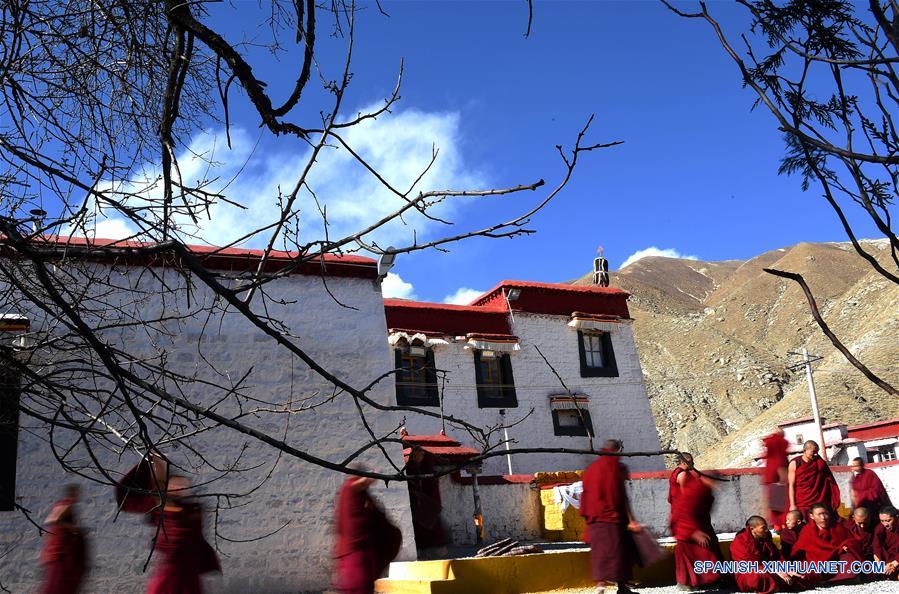 Imagen del 2 de enero de 2017 de monjes alistándose para debatir sobre los sutras del budismo tibetano durante un ensablaje de dharma en la lamasería Jiangsi en el condado de Qushui de Lhasa, capital de la región autónoma del Tíbet, en el suroeste de China. Más de 200 monjes de la lamasería y otros templos participaron el lunes en el ensablaje de dharma. (Xinhua/Chogo)