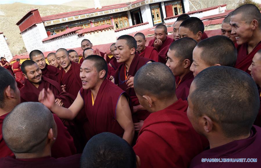 Imagen del 2 de enero de 2017 de monjes debatiendo sobre los sutras del budismo tibetano durante un ensablaje de dharma en la lamasería Jiangsi en el condado de Qushui de Lhasa, capital de la región autónoma del Tíbet, en el suroeste de China. Más de 200 monjes de la lamasería y otros templos participaron el lunes en el ensablaje de dharma. (Xinhua/Chogo)