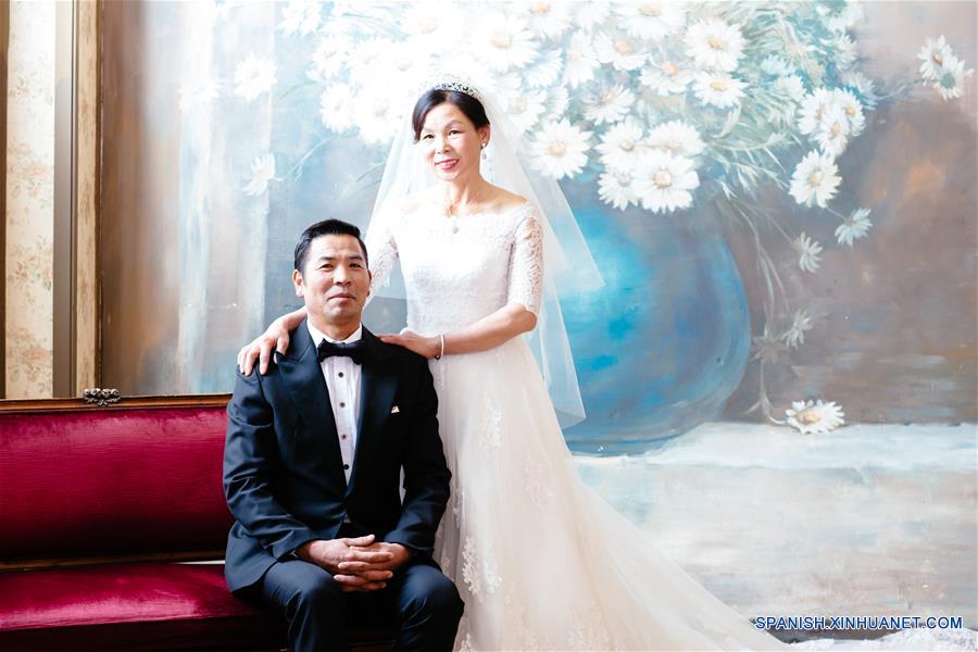 Imagen del 30 de diciembre de 2016 de Huang Jingwen (i) y Yang Yingzhi (d), posando para las fotografías de boda en un estudio fotográfico, en Beijing, capital de China. Huang Jingwen y Yang Yingzhi son de la Prefectura Autónoma Honghe Hani y Yi de la provincia de Yunnan, en el suroeste de China y actualmente trabajan en un proyecto de costrucción en Beijing. Como un regalo de A?o Nuevo, un estudio fotográfico en Beijing tomó fotografías gratis para la pareja que celebrará el 30 aniversario de su matrimonio en 2017. (Xinhua/Zhang Cheng)