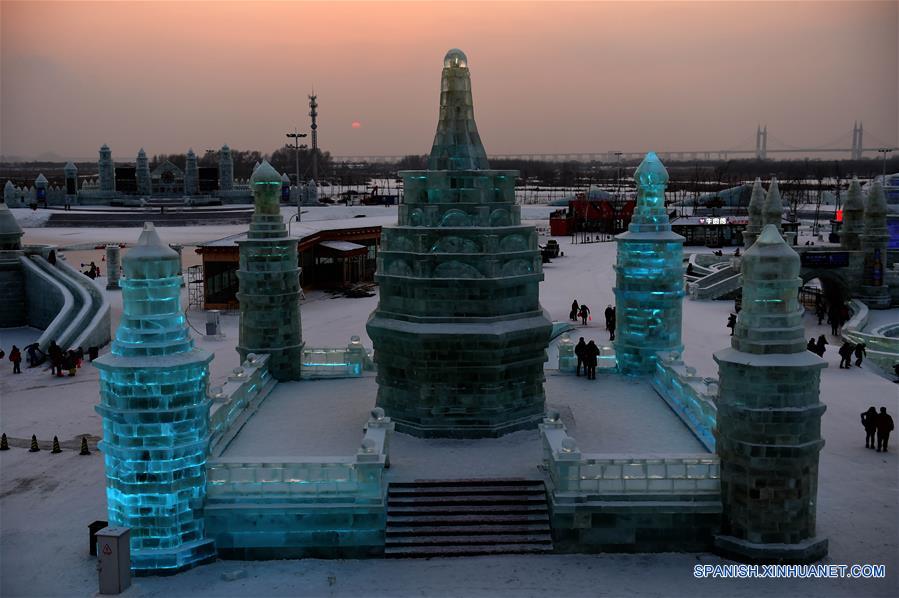 Turistas observan esculturas de hielo en el Mundo de Hielo y Nieve de Harbin, en Harbin, capital de la provincia de Heilongjiang, en el noreste de China, el 3 de enero de 2017. (Xinhua/Wang Jianwei)