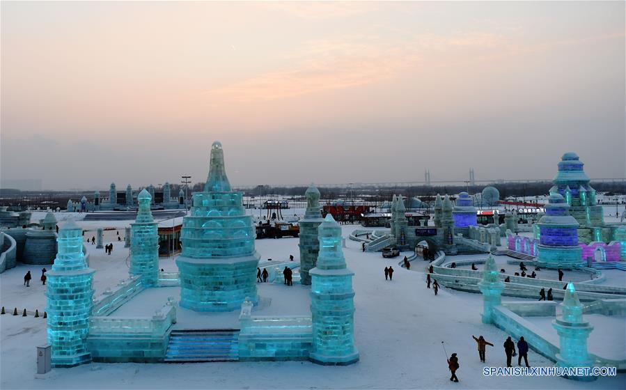 Turistas observan esculturas de hielo en el Mundo de Hielo y Nieve de Harbin, en Harbin, capital de la provincia de Heilongjiang, en el noreste de China, el 3 de enero de 2017. (Xinhua/Wang Jianwei)