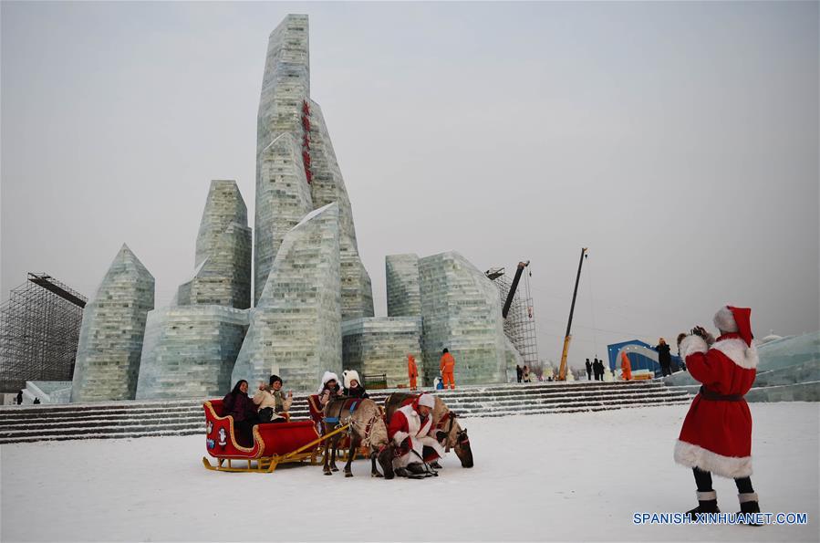 Turistas posan frente a esculturas de hielo en el Mundo de Hielo y Nieve de Harbin, en Harbin, capital de la provincia de Heilongjiang, en el noreste de China, el 3 de enero de 2017. (Xinhua/Wang Jianwei)