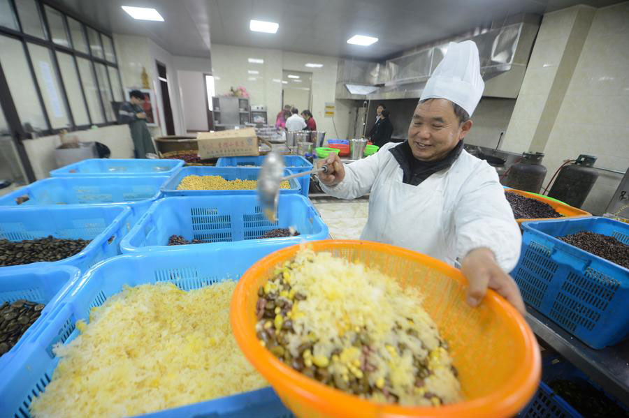 Un cocinero prepara gachas Laba en el templo Daming en Yangzhou, provincia de Jiangsu, el 4 de enero de 2017. [Foto / Xinhua]