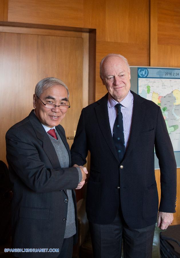 GINEBRA, enero 6, 2017 (Xinhua) -- Xia Xiaoyan (i), el enviado especial del gobierno chino para el asunto sirio, estrecha la mano con el enviado especial de la Organización de Naciones Unidas (ONU) para Siria, Staffan de Mistura (d), durante su reunión en Ginebra, Suiza, el 6 de enero de 2017. El enviado especial del gobierno chino para el asunto sirio, Xie Xiaoyan, dijo el viernes que tanto la ONU como China dan la bienvenida a las próximas conversaciones en Astaná con la esperanza de que rindan frutos para el proceso político del país devastado por la guerra. (Xinhua/Xu Jinquan)