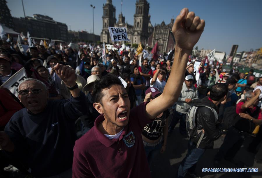 CIUDAD DE MEXICO, enero 8, 2017 (Xinhua) -- Residentes gritan consignas durante una marcha pacífica contra el aumento en el precio de la gasolina, en el Zócalo de la Ciudad de México, capital de México, el 8 de enero de 2017.De acuerdo con información de la prensa local, al menos en 15 estados se llevaron a cabo manifestaciones durante el octavo día consecutivo de protestas contra el aumento en el precio de la gasolina. (Xinhua/David de la Paz)