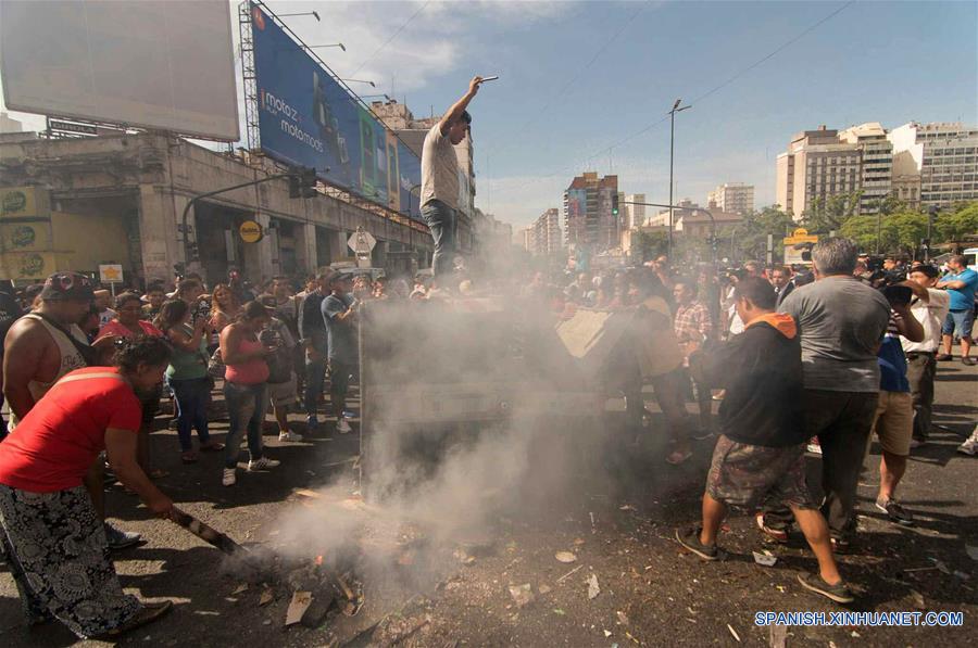 Manteros (vendedores ambulantes) queman maderos mientras cortan parcialmente durante una protesta la avenida Pueyrredón, en la zona donde esta madrugada se montó un fuerte operativo policial para desalojarlos, en el barrio porte?o de Once, en Buenos Aires, Argentina, el 10 de enero de 2017. Al menos dos manteros detenidos, dos heridos leves de la policía local y un periodista lesionado fue el saldo que arrojó el operativo policial llevado a cabo el mediodía del martes en las proximidades de la estación Miserere, en el barrio porte?o de Onve, para dispersar una protesta de vendedores callejeros en reacción a un desalojo de más de 2,000 puestos de venta ilegal de mercadería, informaron fuentes policiales de la ciudad. Tras los incidentes habrá una reunión entre los manteros y el Gobierno de la Ciudad, de acuerdo con información de la prensa local. (Xinhua/Carlos Brigo/TELAM)