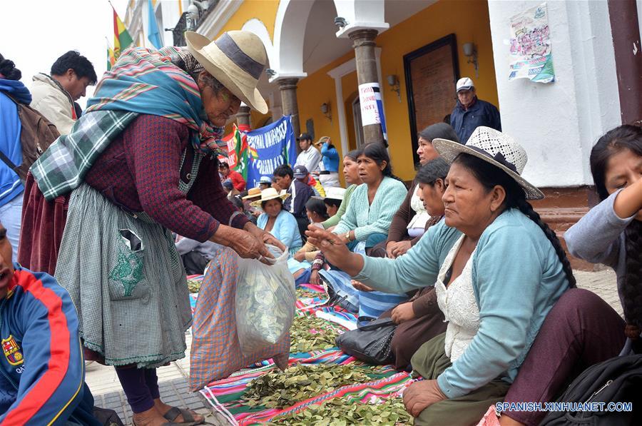 Personas participan durante un festejo en el marco del Día Nacional del Acullico, en Cochabamba, Bolivia, el 11 de enero de 2017. Bolivia conmemora el miércoles el Día Nacional del Acullico (masticación de la hoja de coca) con una serie de actividades, con el fin de mostrar al mundo las bondades de la planta y sus derivados. Según el ministro boliviano de Desarrollo Rural y Tierras, César Cocarico, el 11 de enero se conmemora el Día Nacional del Acullico, debido a que en esa fecha de 2013 Bolivia se adhirió a la "Convención única de las Naciones Unidas sobre Estupefacientes de 1961, emanada del Protocolo de 1972", con la reserva de permitir la masticación tradicional de la hoja de coca en todo el territorio nacional. El acullico es la masticación de la hoja de coca y es un modo de consumo particular ancestral y tradicional, como símbolo de diálogo, reciprocidad y equilibrio con la naturaleza, la masticación tradicional es conocida en los valles como "boleo" y en el este como "pijcheo". (Xinhua/Patricio Pinto/ABI)