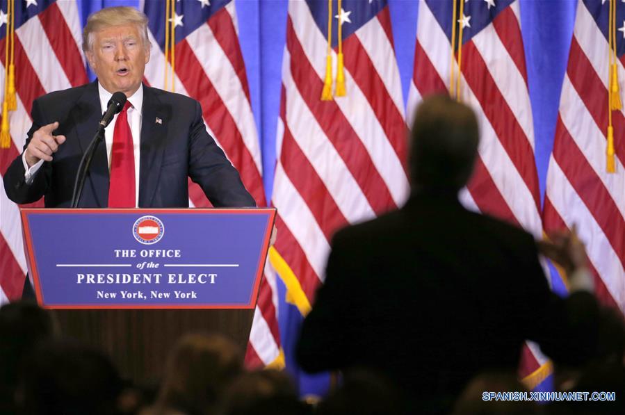 El presidente electo de Estados Unidos de América, Donald Trump, sostiene una conferencia de prensa, en Nueva York, Estados Unidos de América, el 11 de enero de 2017. El presidente electo estadounidense, Donald Trump, se reunió con representantes de los medios de comunicación para su primera conferencia de prensa desde las elecciones presidenciales. (Xinhua/Gary Hershorn)