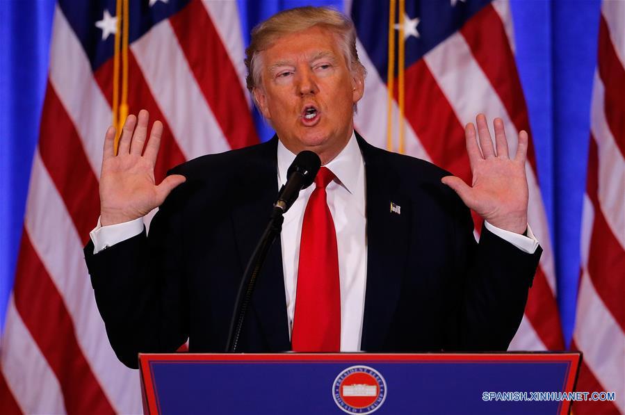 El presidente electo de Estados Unidos de América, Donald Trump, sostiene una conferencia de prensa, en Nueva York, Estados Unidos de América, el 11 de enero de 2017. El presidente electo estadounidense, Donald Trump, se reunió con representantes de los medios de comunicación para su primera conferencia de prensa desde las elecciones presidenciales. (Xinhua/Gary Hershorn/ZUMAPRESS)