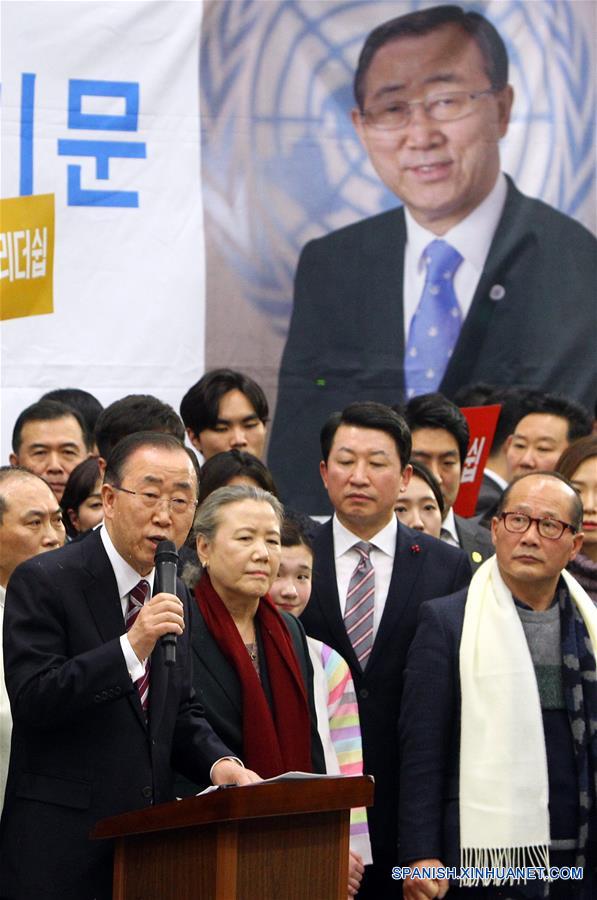 INCHEON, enero 12, 2017 (Xinhua) -- Ban Ki-moon (i-frente), ex secretario general de la Organización de las Naciones Unidas (ONU), pronuncia un discurso después de llegar al Aeropuerto Internacional de Incheon, en Incheon, República de Corea, el 12 de enero de 2017. El ex secretario general de la ONU, Ban Ki-moon, intentó mostrar su identidad amistosa a las personas el jueves a su regreso a su país natal, República de Corea, tras el final de su mandato de 10 a?os en el máximo puesto de la ONU. (Xinhua/Yao Qilin)