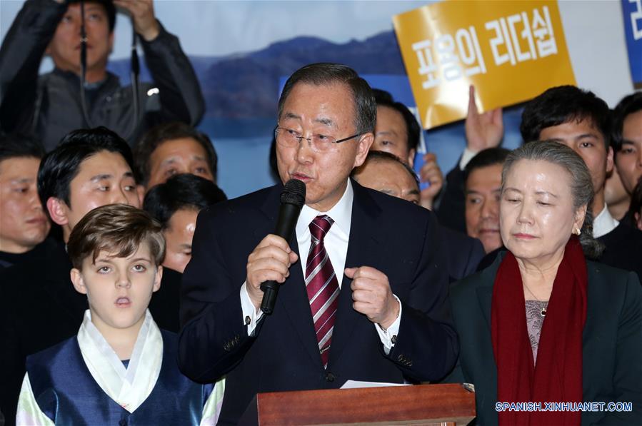 INCHEON, enero 12, 2017 (Xinhua) -- Ban Ki-moon (c), ex secretario general de la Organización de las Naciones Unidas (ONU), pronuncia un discurso después de llegar al Aeropuerto Internacional de Incheon, en Incheon, República de Corea, el 12 de enero de 2017. El ex secretario general de la ONU, Ban Ki-moon, intentó mostrar su identidad amistosa a las personas el jueves a su regreso a su país natal, República de Corea, tras el final de su mandato de 10 a?os en el máximo puesto de la ONU. (Xinhua/Lee Sang-ho)