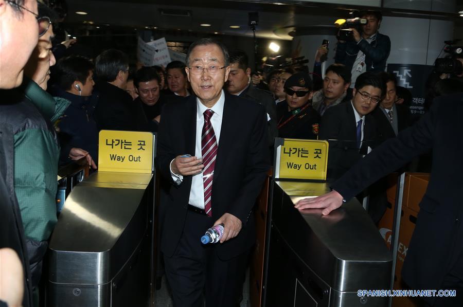 INCHEON, enero 12, 2017 (Xinhua) -- Ban Ki-moon (c), ex secretario general de la Organización de las Naciones Unidas (ONU), pasa a través de un torniquete del Aeropuerto Express, en Incheon, República de Corea, el 12 de enero de 2017. El ex secretario general de la ONU, Ban Ki-moon, intentó mostrar su identidad amistosa a las personas el jueves a su regreso a su país natal, República de Corea, tras el final de su mandato de 10 a?os en el máximo puesto de la ONU. (Xinhua/Lee Sang-ho)