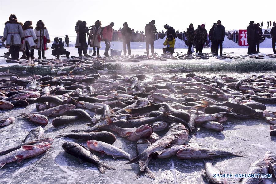 Pescadores recolectan peces luego de la pesca en hielo en el Lago Ulunggur en el condado de Fuhai, en la Región Autónoma Uygur de Xinjiang, en el noroeste de China, el 14 de enero de 2017. (Xinhua/Jiang Wenyao)