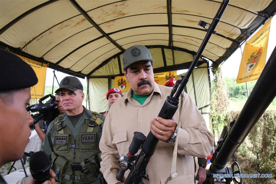 Imagen cedida por la Presidencia de Venezuela del presidente venezolano, Nicolás Maduro (d), asistiendo al Ejercicio de Acción Integral Antiimperialista Zamora 200, en las instalaciones del Fuerte Guaicaipuro, en el estado Miranda, Venezuela, el 14 de enero de 2017. Este fin de semana se lleva a cabo el Ejercicio de Acción Integral Antiimperialista Zamora 200, en el que participarán más de 100,000 hombres y mujeres de los cuatro componentes de la Fuerza Armada Nacional Bolivariana (FANB) del país, informó el segundo comandante del Comando Estratégico Operacional (CEO), de la FANB, Remigio Ceballos, explicando que esta acción cívico-militar tiene su proceso de planificación desde el 28 de diciembre de 2016, por instrucciones del presidente venezolano, Nicolás Maduro, y su objetivo estratégico es preparar al pueblo en la defensa integral del país, de acuerdo con información de la prensa local. (Xinhua/Presidencia de Venezuela)