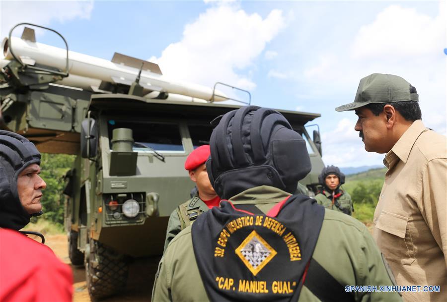 Imagen cedida por la Presidencia de Venezuela del presidente venezolano, Nicolás Maduro (d), asistiendo al Ejercicio de Acción Integral Antiimperialista Zamora 200, en las instalaciones del Fuerte Guaicaipuro, en el estado Miranda, Venezuela, el 14 de enero de 2017. Este fin de semana se lleva a cabo el Ejercicio de Acción Integral Antiimperialista Zamora 200, en el que participarán más de 100,000 hombres y mujeres de los cuatro componentes de la Fuerza Armada Nacional Bolivariana (FANB) del país, informó el segundo comandante del Comando Estratégico Operacional (CEO), de la FANB, Remigio Ceballos, explicando que esta acción cívico-militar tiene su proceso de planificación desde el 28 de diciembre de 2016, por instrucciones del presidente venezolano, Nicolás Maduro, y su objetivo estratégico es preparar al pueblo en la defensa integral del país, de acuerdo con información de la prensa local. (Xinhua/Presidencia de Venezuela)