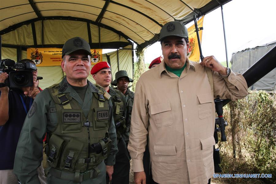 Imagen cedida por la Presidencia de Venezuela del presidente venezolano, Nicolás Maduro (d) junto al ministro de Defensa, Vladimir Padrino (i), asistiendo al Ejercicio de Acción Integral Antiimperialista Zamora 200, en las instalaciones del Fuerte Guaicaipuro, en el estado Miranda, Venezuela, el 14 de enero de 2017. Este fin de semana se lleva a cabo el Ejercicio de Acción Integral Antiimperialista Zamora 200, en el que participarán más de 100,000 hombres y mujeres de los cuatro componentes de la Fuerza Armada Nacional Bolivariana (FANB) del país, informó el segundo comandante del Comando Estratégico Operacional (CEO), de la FANB, Remigio Ceballos, explicando que esta acción cívico-militar tiene su proceso de planificación desde el 28 de diciembre de 2016, por instrucciones del presidente venezolano, Nicolás Maduro, y su objetivo estratégico es preparar al pueblo en la defensa integral del país, de acuerdo con información de la prensa local. (Xinhua/Presidencia de Venezuela)