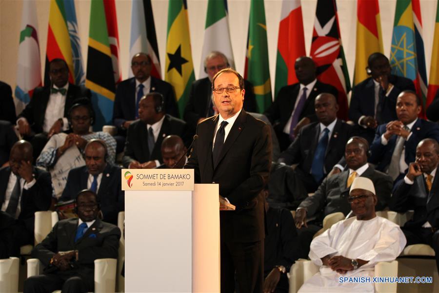 El presidente de Francia, Francois Hollande, pronuncia un discurso durante la ceremonia de inauguración de la XXVII Cumbre Africa-Francia, en Bamako, Mali, el 14 de enero de 2017. Líderes africanos y franceses comenzaron una cumbre el sábado en Bamako sobre máxima seguridad, enfocándose en temas clave incluyendo la paz y la seguridad, el clima y la economía. (Xinhua/Diop)