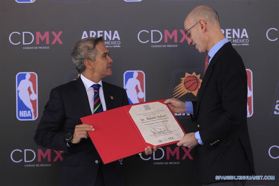 El jefe de Gobierno de la Ciudad de México, Miguel Angel Mancera (i), participa durante la inauguración de cuatro canchas de baloncesto rehabilitadas en Ciudad Deportiva de Magdalena Mixhuca en la Ciudad de México, capital de México, el 14 de enero de 2017. De acuerdo con información de la prensa local, las canchas fueron rehabilitadas con apoyo del programa de la Asociación Nacional de Baloncesto (NBA, por sus siglas en inglés) estadounidense, NBA Cares Legacy. (Xinhua/Str)