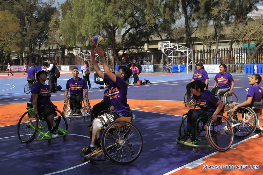 Jugadores de baloncesto en silla de ruedas participan durante un partido por la inauguración de cuatro canchas de baloncesto rehabilitadas en Ciudad Deportiva de Magdalena Mixhuca en la Ciudad de México, capital de México, el 14 de enero de 2017. De acuerdo con información de la prensa local, las canchas fueron rehabilitadas con apoyo del programa de la Asociación Nacional de Baloncesto (NBA, por sus siglas en inglés) estadounidense, NBA Cares Legacy. (Xinhua/Str)
