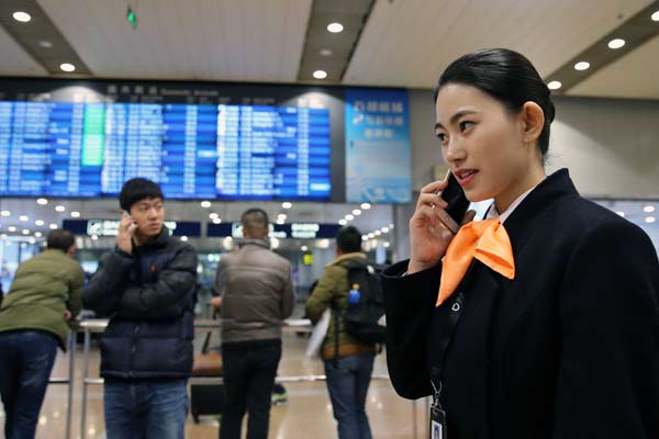 Gong Xiaopei se comunica con los pasajeros en el Aeropuerto Internacional de Beijing. [Foto: Wang Zhuangfei]