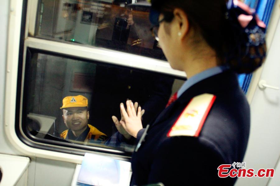 Hubei, 17/01/2017 (El Pueblo en Línea) - Zeng Cheng se despide de su esposo Bai Jiangxu en la estación Zhijiang en la ciudad de Zhijiang, provincia de Hubei, el 12 de enero de 2017. Bai trabaja en la estación mientras su esposa es conductora del tren k935 que realiza la ruta entre Xiangyang en Hubei y Guangzhou en Guangdong, y para sólo durante tres minutos en la estación. Bai y Zeng se ven durante tres minutos cada ocho días, pero durante la temporada del Festival de Primavera, la pareja, ambos nacidos en la década de los 90, no tiene tiempo ni incluso para esos tres minutos. (Foto: Servicio de Noticias de China / Dai Qiaosheng)