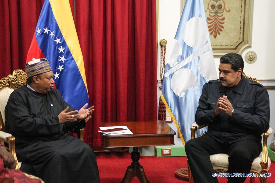 El presidente venezolano, Nicolás Maduro (d), conversa con el secretario general de la Organización de Países Exportadores de Petróleo (OPEP), Mohammed Barkindo (i), en el Palacio de Miraflores, en Caracas, Venezuela, el 16 de enero de 2017. El presidente de Venezuela, Nicolás Maduro, recibió el lunes en el Palacio de Miraflores al secretario general de la OPEP, Mohammed Barkindo, con quien abordará la situación del mercado energético global. (Xinhua/Boris Vergara)