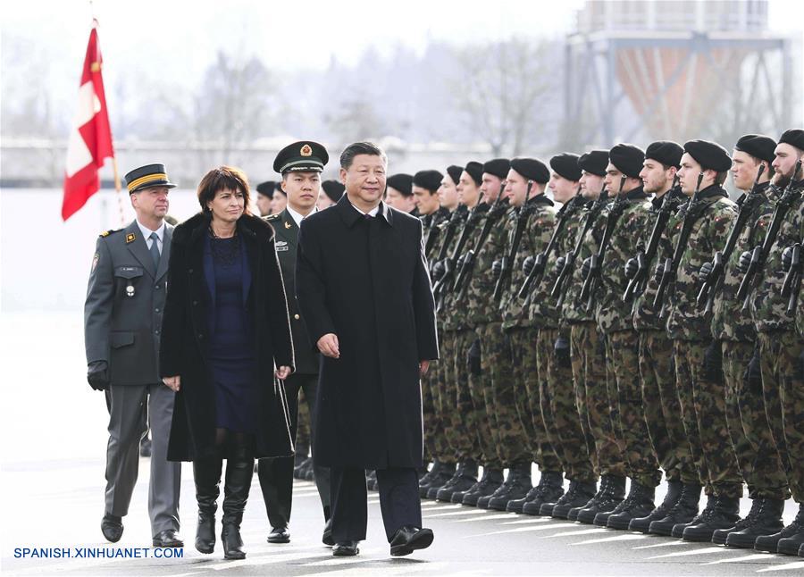 ZURICH, enero 15, 2017 (Xinhua) -- Acompa?ado por Doris Leuthard, el presidente de China, Xi Jinping, inspeccionó la guardia de honor mientras una banda militar tocaba los himnos nacionales de los dos países. (Xinhua/Lan Hongguang)