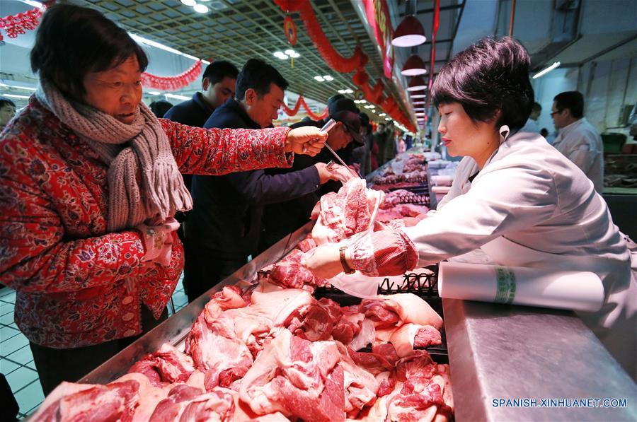 Personas eligen productos alimenticios en un supermercado, en la ciudad de Hengshui, provincia de Hebei, en el norte de China, el 17 de enero de 2017. Cuando el Festival de Primavera se aproxima, los supermercados en la ciudad de Hengshui organizaron actividades de promoción de ventas en varias formas para atraer a los ciudadanos. (Xinhua/Zhu Xudong)