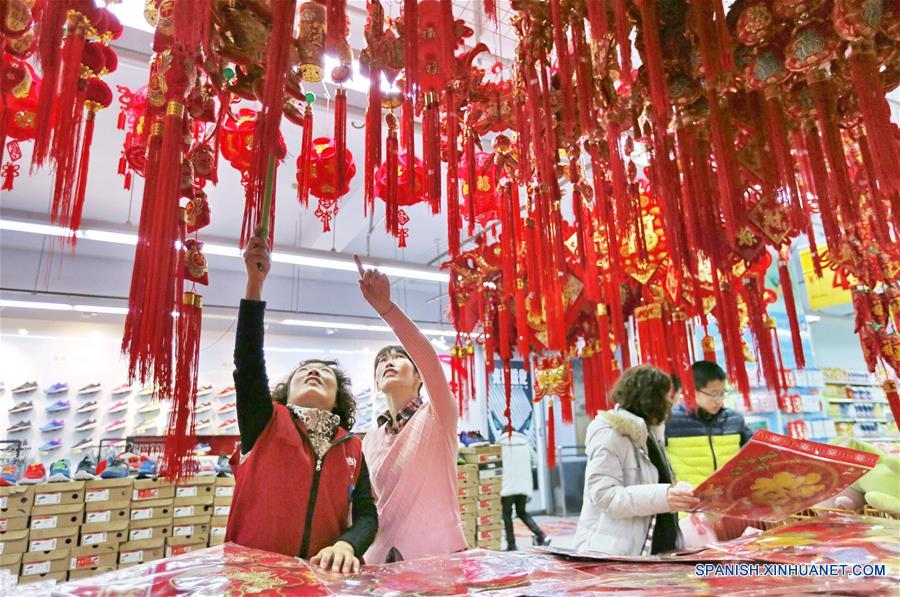 HEBEI, enero 17, 2017 (Xinhua) -- Personas eligen decoraciones de A?o Nuevo en un supermercado, en la ciudad de Hengshui, provincia de Hebei, en el norte de China, el 17 de enero de 2017. Cuando el Festival de Primavera se aproxima, los supermercados en la ciudad de Hengshui organizaron actividades de promoción de ventas en varias formas para atraer a los ciudadanos. (Xinhua/Zhu Xudong)