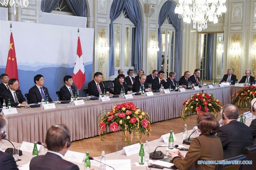 BERNA, 16 ene (Xinhua) -- Acompa?ado por su homóloga suiza Doris Leuthard, Xi se reúne con líderes empresariales suizos. (Xinhua/Li Xueren)