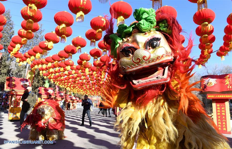 BEIJING, enero 20, 2017 (Xinhua) -- Artistas folcóricos interpretan la danza del león durante un ensayo para una próxima feria del templo, en el Parque Badachu en Beijing, capital de China, el 20 de enero de 2017. La feria del templo comenzará el 28 de enero, el primer día del A?o Nuevo Lunar chino. (Xinhua/Li Jundong)
