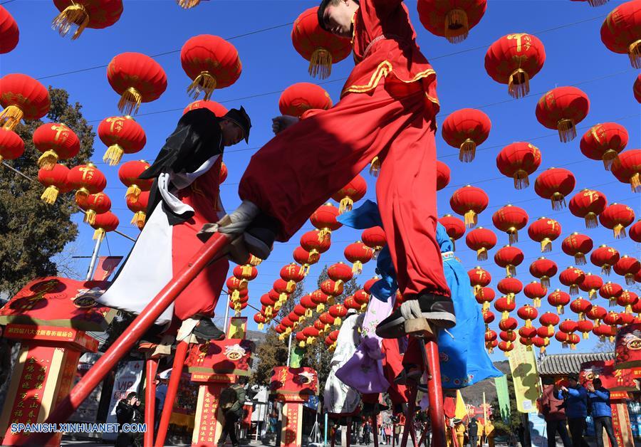 BEIJING, enero 20, 2017 (Xinhua) -- Artistas folclóricos actúan sobre zancos durante un ensayo para una próxima feria del templo, en el Parque Badachu en Beijing, capital de China, el 20 de enero de 2017. La feria del templo comenzará el 28 de enero, el primer día del A?o Nuevo Lunar chino. (Xinhua/Li Jundong)