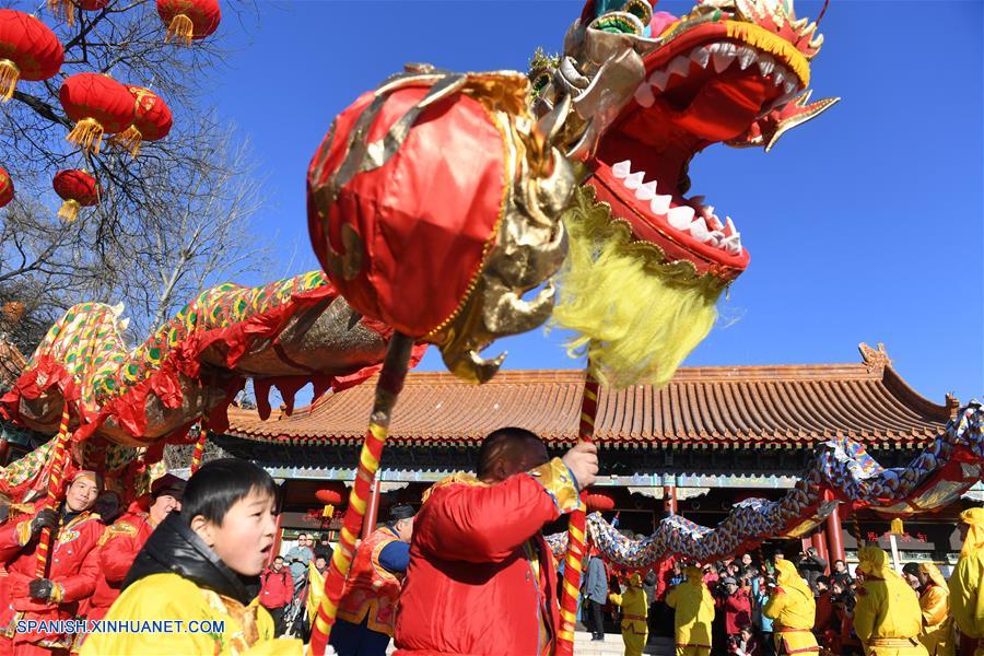 BEIJING, enero 20, 2017 (Xinhua) -- Artistas folclóricos interpretan la danza del dragón durante un ensayo para una próxima feria del templo, en el Parque Badachu en Beijing, capital de China, el 20 de enero de 2017. La feria del templo comenzará el 28 de enero, el primer día del A?o Nuevo Lunar chino. (Xinhua/Li Jundong)