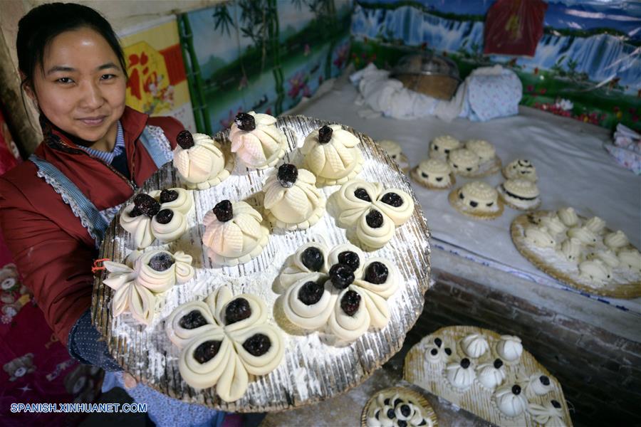SHANDONG, enero 20, 2017 (Xinhua) -- Jia Yunping muestra las tartas de jujube recién elaboradas, en la villa de Qianzhai del condado de Chiping, provincia de Shandong, en el este de China, el 20 de enero de 2017. Los residentes de esta villa tienen la tradición de elaborar bollos al vapor con distintos patrones para saludar al Festival de Primavera. (Xinhua/Zhao Yuguo)