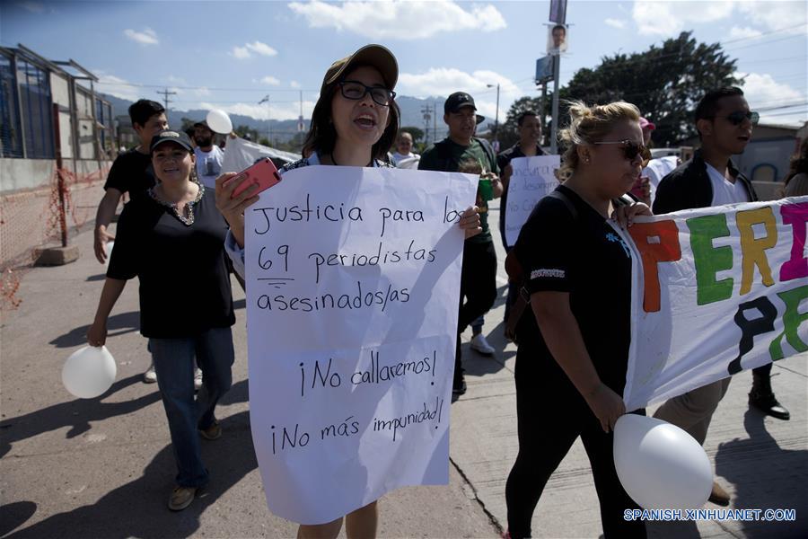 Un grupo de estudiantes de la Universidad Nacional Autónoma de Honduras participa durante una protesta por la muerte de periodistas y comunicadores sociales en Honduras, en Tegucigalpa, capital de Honduras, el 21 de enero de 2017. Desde 2003, unas 69 personas vinculadas a los medios de comunicación han sido asesinadas en el país, según el Comisionado Nacional de Derechos Humanos (CONADEH) de Honduras. (Xinhua/Rafael Ochoa)