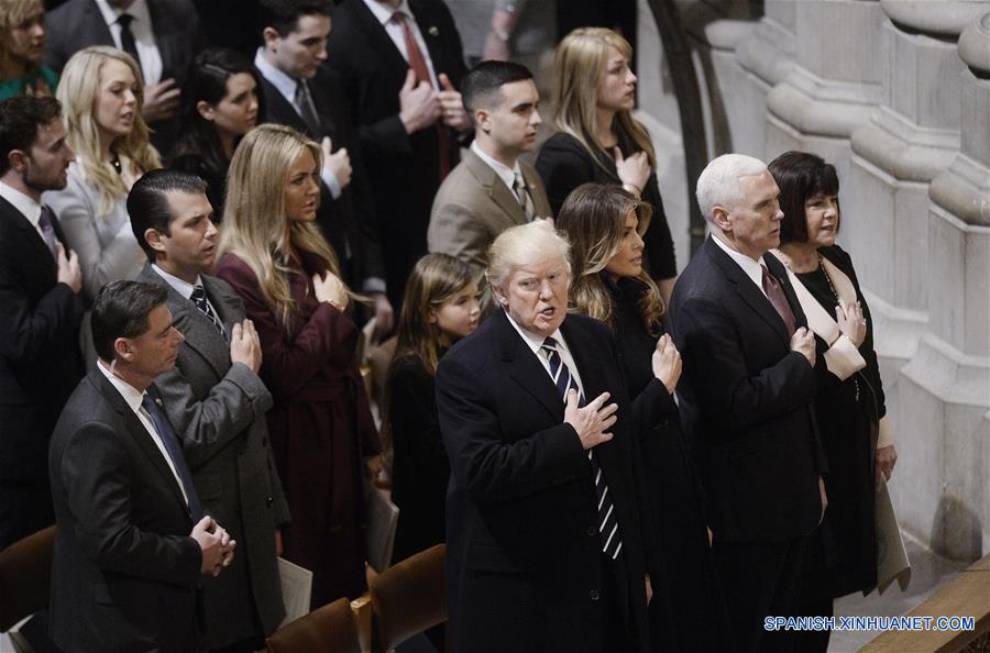 El presidente de Estados Unidos de América, Donald Trump (i-frente), junto a su esposa, la primera dama Melania Trump (2-i-frente), el vicepresidente, Mike Pence (2-d-frente), y su esposa Karen Pence (d-frente), asisten a un servicio religioso en la Catedral Nacional, en Washington D.C., Estados Unidos de América, el 21 de enero de 2017. El presidente estadounidese, Donald Trump, comenzó su primera jornada completa en funciones en un servicio religioso, el último ritual de la transición antes de dedicarse de lleno a las tareas gubernamentales, de acuerdo con inforación de la prensa local. (Xinhua/Olivier Douliery/CNP/ZUMAPRESS)