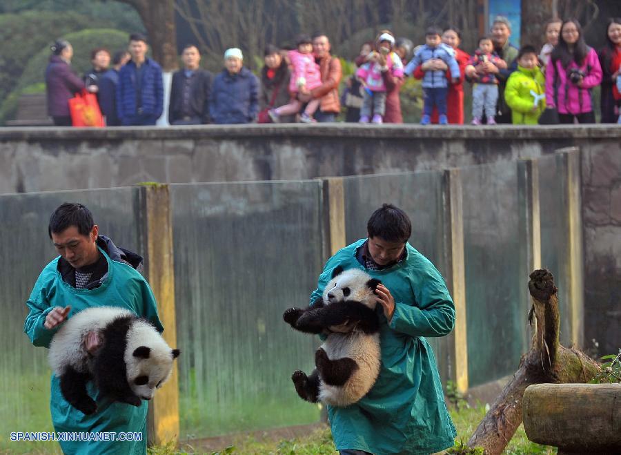 CHONGQING, enero 22, 2017 (Xinhua) -- Los cachorros gemelos de panda gigante Dashuang (i) y Xiaoshuang (d), son cargados en el Zoológico de Chongqing, en Chongqing, en el suroeste de China, el 22 de enero de 2017. Los cachorros gemelos, nacidos en julio de 2016, conocieron al público el domingo. (Xinhua/Chen Cheng)