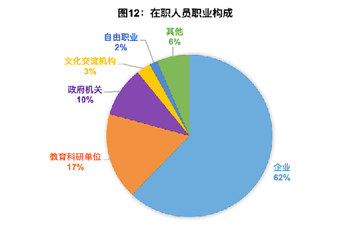 Entre los 755 cuestionados que tienen trabajo, el 62% laboran en empresas, el 17% en entidades de educación e investigación y el 10% en agencias estatales. Esto indica que las empresas son las principales entidades empleadoras de graduados en idioma espa?ol y la proporción sigue subiendo. En su mayoría, ellos se desempe?an como traductores y vendedores en sectores como el comercio, industria de la información, construcción de infraestructura, energía y manufactura.