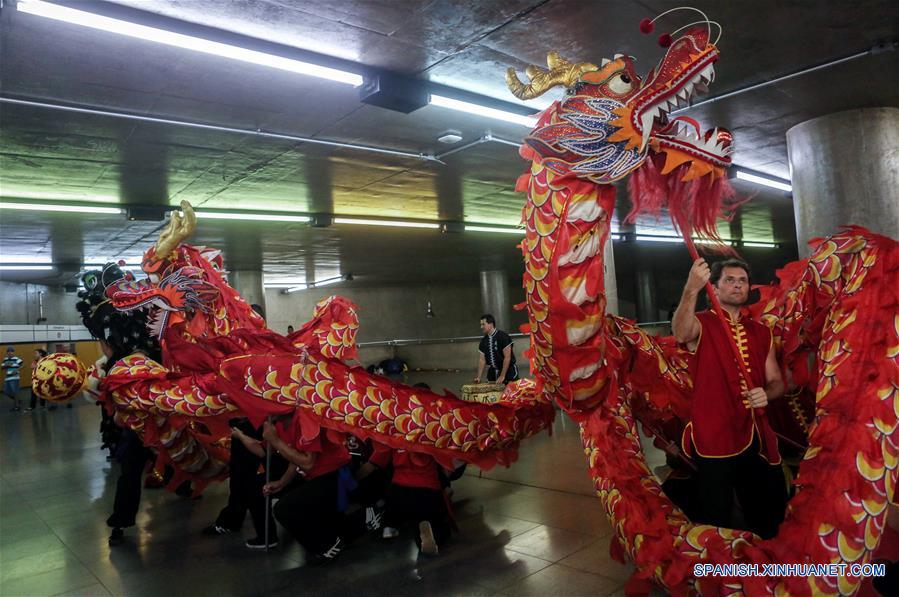 Una danza del dragón y del león es interpretada para anunciar las celebraciones del A?o Nuevo Lunar chino, en el interior de la Estación Sé del Metro de Sao Paulo, en Sao Paulo, Brasil, el 24 de enero de 2017. El Festival de Primavera o A?o Nuevo Lunar chino, se celebra el 28 de enero este a?o. (Xinhua/Rahel Patrasso)