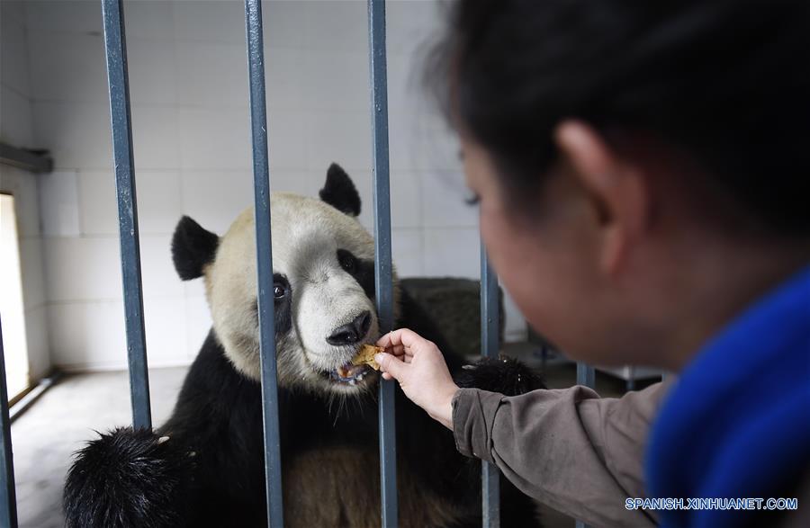 La cuidadora Liu Yi alimenta a un panda gigante en la base de Dujiangyan del Centro de Conservación e Investigación para el Panda Gigante de China, en la provincia de Sichuan, en el suroeste de China, el 27 de enero de 2017. Los empleados siguen trabajando en el centro para cuidar de los pandas gigantes durante las vacaciones del Festival de Primavera. (Xinhua/Xue Yubin)